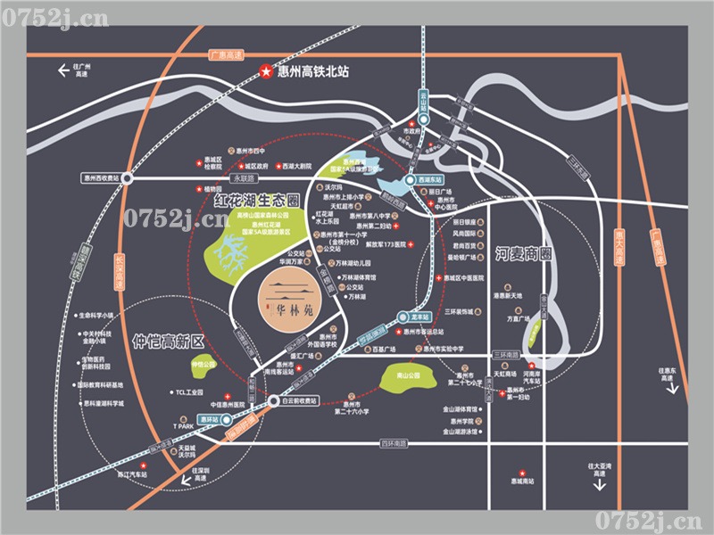 协欣华林苑是协欣房产进军惠州的开山之作。项目地处红花湖南门口,紧邻金榜路、金恺大道以及仲恺大道,是连接城区与仲恺高新区的枢纽之地。建筑面积约74203㎡,总户数460户,其中住宅352户,酒店108套。总共4栋高层,1、2、3栋为住宅,4栋为酒店。享红花湖、南湖、万林湖三湖之景,背靠高榜山,风景独美。华林苑将中式的端庄典雅和西式的简洁大方结合成中魂西韵的新中式建筑风格。4栋高层围合,辅以精致园景,将项目自身融入红花湖生态区。内外园景相映,将自然与人文以完美的尺度结合起来。