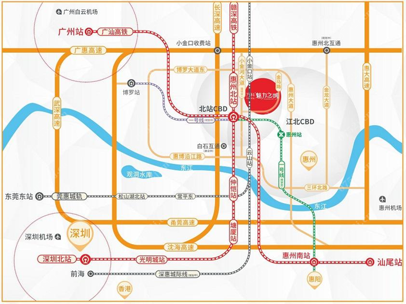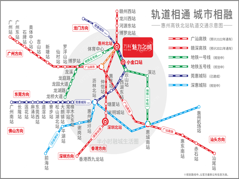 万科时隔12年重归惠城,定鼎惠州北站CBD。惠州北站新城定位为惠州城市核心区,未来规划成为高铁CBD,总规划面积44平方公里,未来人口达42万。在大湾区时代背景下,惠州北站已经成为惠州强势融入港深的核动力。项目周边7轨3高速,赣深高铁下三站直达深圳北。