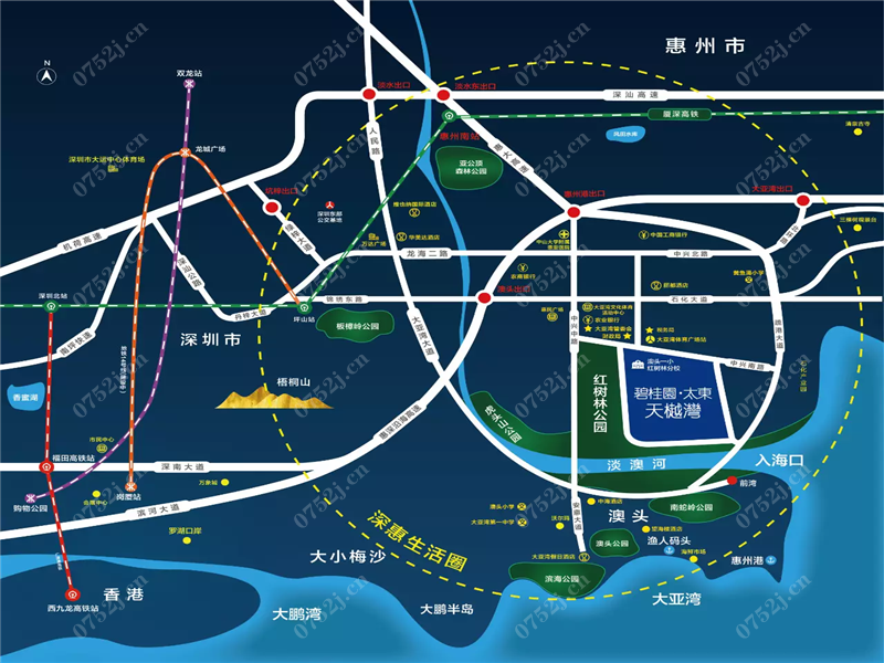 碧桂园·太东天樾湾规划建设约2.5万㎡湿地风情商业街,幼儿园、 配套,私家双跑道、双主题泳池、篮球场、羽毛球场等全龄活动场所以及多主题泛会所等。碧桂园·太东天樾湾位于大亚湾 区地段,区域内政企齐聚,如:大亚湾管委会、国税局、地税局、财政局、体育馆、检察院等市政机关和比亚迪等大型企业汇聚在此。