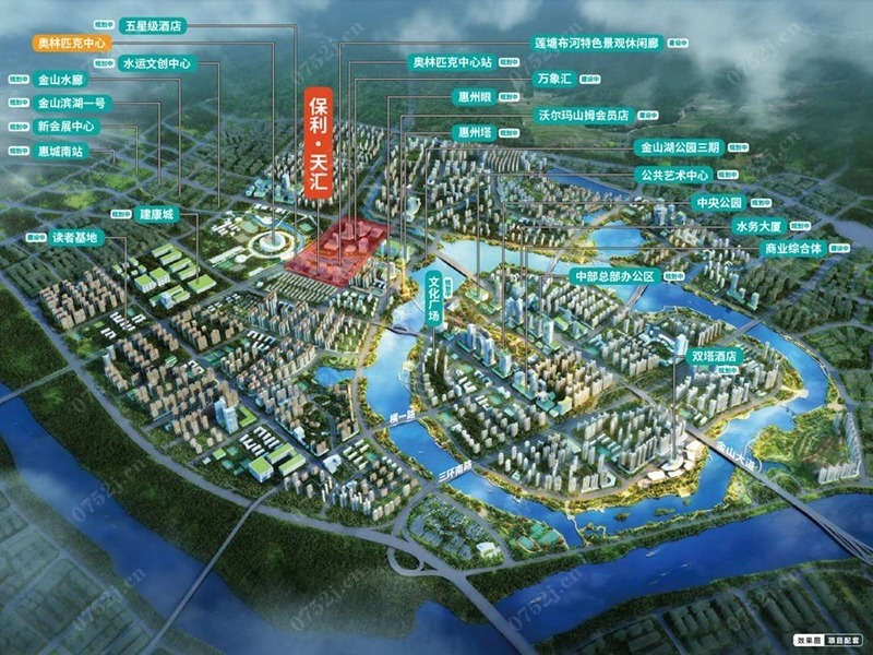 保利万象天汇广场项目,位于惠城区金山大道与四环南路交界处,总占地面积约19.19万方,总建筑面积约86.6万方,以河道为界分东、西两个地块。
