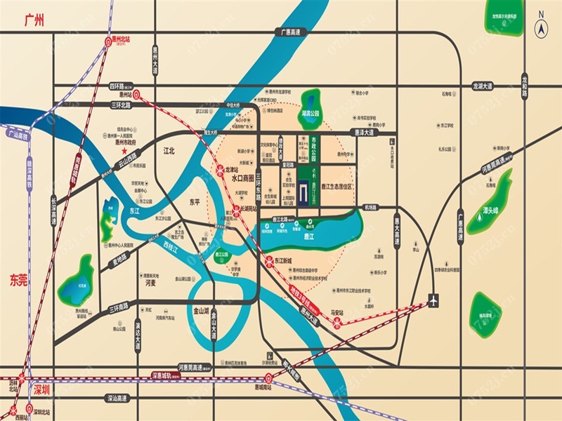 保利鹿江来是国资委直属大型央企保利打造的生态教育品质大盘。项目地处于惠州水口核心地带(皇冠路旁),是承载城市居住功能的江东CLD(商业中央生活区),周边有惠州中学(市直公办重点学校)、第五十七小学(规划)、合生实验学校、规划中幼儿园等多所学校,教育配套十分完善。项目也有丰富的江景公园资源:“两区四景”的曲水湾主题公园、 3公里长的漉江沥公园、近10万平的湖滨公园和7.7公里洛塘渠公园,同时项目自建约2万㎡市政活力运动公园,超豪华的生态资源配套引领惠州公园人居新高度。 保利鹿江来,项目总占地约6万㎡,建面约23万㎡,整体容积率2.8,绿化率35%。项目总户数为1519户,1681个车位,1:1.1的车户比,最大满足停车需求。项目外侧建有超8000平的沿街商铺,提供生活日常所需便利。