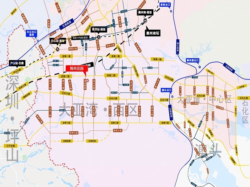 锦尚花园位于大亚湾龙海二路与龙山四路交汇处东南角,由惠州大亚湾浩晔房地产开发有限公司开发建设。
