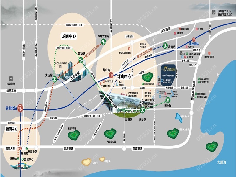 荣佳国韵具体位于大亚湾龙山一路与西南大道交汇处(深圳坪山兰竹东路往东约800米),南面是兰竹路东段的西南大道,直通坪山 区域,北面是石化大道,连接坪山锦绣东路,向东则连接沿海高速澳头出口,通往深圳罗湖福田。荣佳国韵占地面积18万平米,建筑面积73万平米,其中,一期共计1184套,产品面积段为74-125㎡的2-4房单位,总户数近5000户。