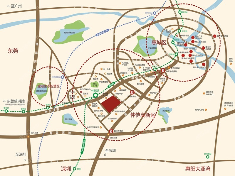 隆生仲恺花园是惠州隆生企业建设的超百万平米生活大城。项目位于惠州市仲恺区,临近仲恺大道,距城轨仲恺站500米,步行五分钟即可到达;接驳长深高速、潮莞高速路口,连接珠三角等城市;毗邻6.6万㎡一站式购物中心,沃尔玛、万达影院尽在其中,吃喝玩乐购一站式解决;周边学校环绕,规划幼儿园、规划公立小学、省一级学校仲恺中学、九年制仲恺实验学校;项目目前规划总占地面积约32万平方米,总建筑面积约150万平米,建成后总居住户数将接近1万户,居住人口将达到3万人左右,成为整个仲恺最大的花园社区。