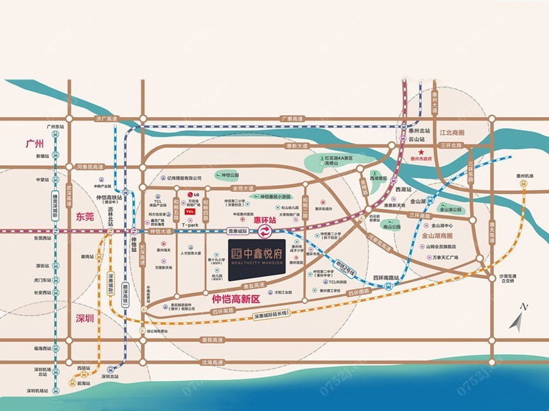项目位于仲恺大道与惠环轻轨站D出口处,打造仲恺TOD百万综合体项目,规划有商业、写字楼、酒店等涵盖住、娱、工、商、文为一体。